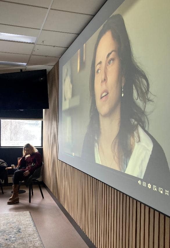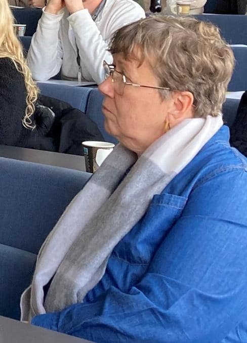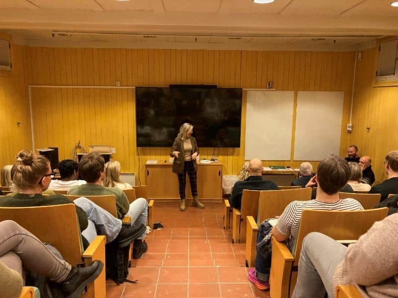 Vinterlige reiser med tog, buss eller fly mellom hjemstedet og arrangørstedet er anstrengende og er ingen selvfølge. Maria stiller likevel opp hver gang det er mulig for henne for å formidle ‘innside’-kunnskap om psykose, etikk og holdninger. Bildet er tatt i undervisningslokalet 7. januar.